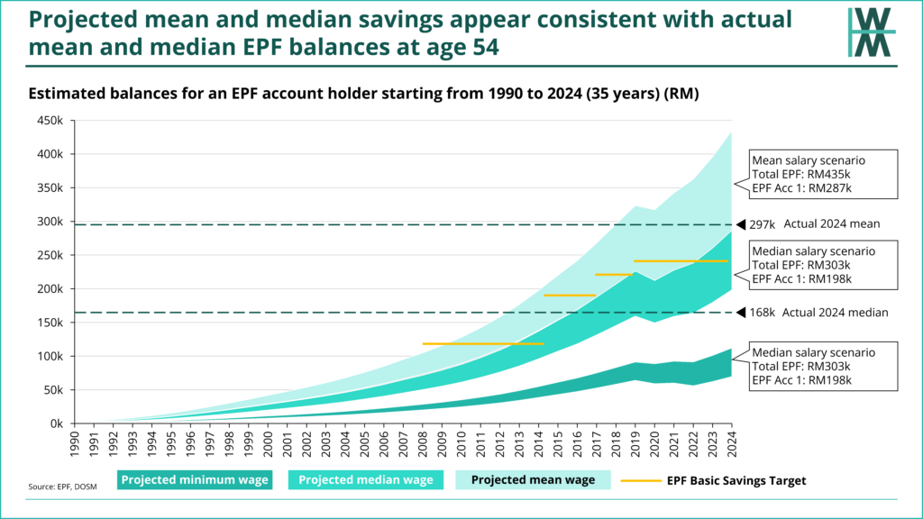 I’ve marked the projections against the actual current mean and median balance of active EPF members aged 54 years old in 2024. Results are below: