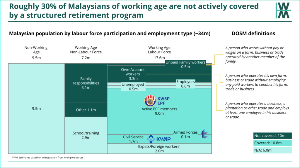 - ~40% of working-age Malaysians are not actively covered by any kind of retirement program