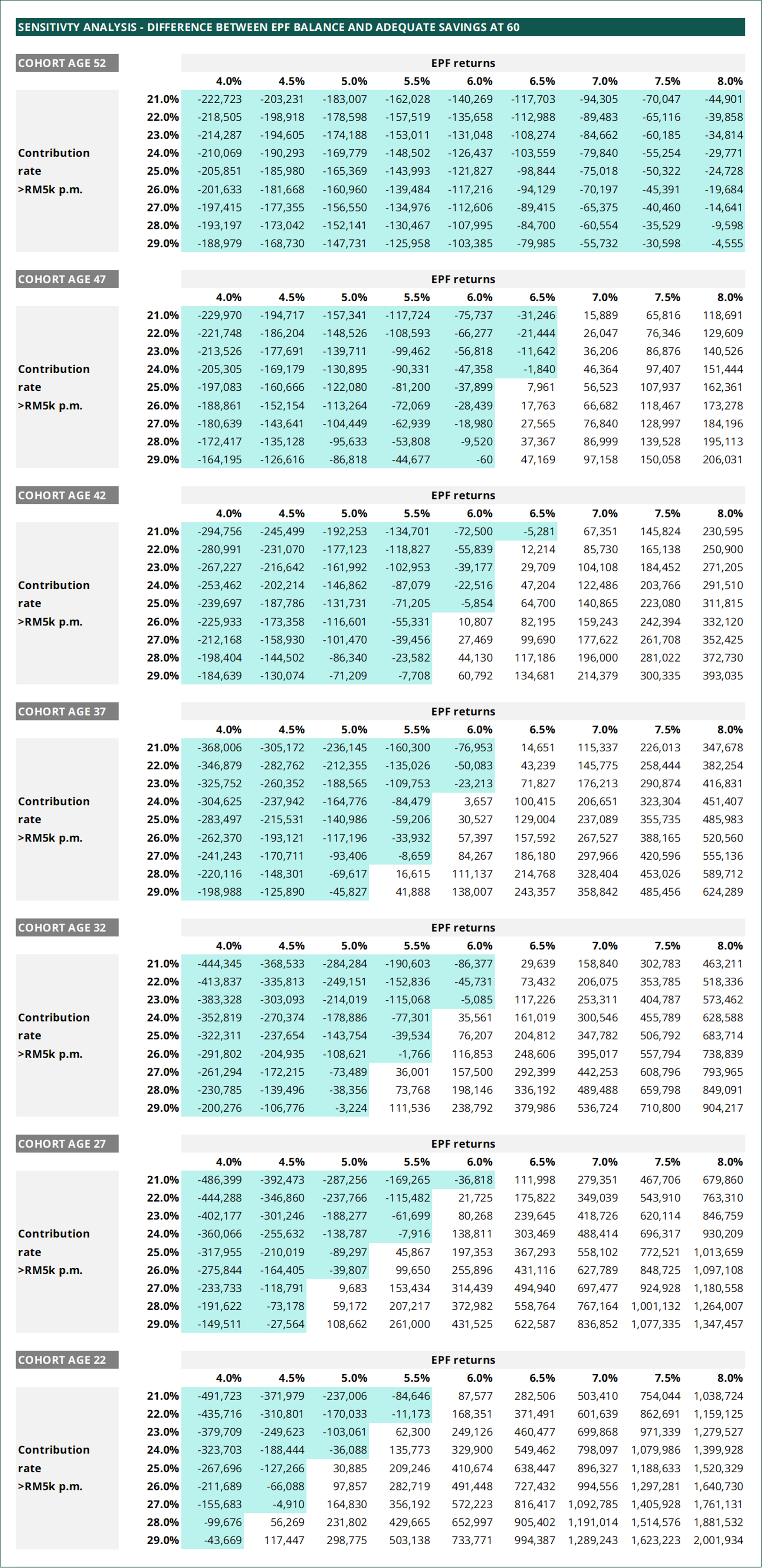 So a positive balance means the average EPF balance exceeds the savings target. A negative number means there is a deficit, which is highlighted in light teal.