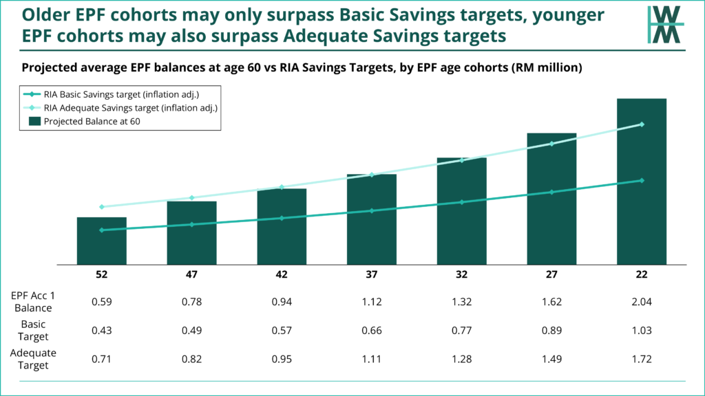 • Only cohorts aged 37 and younger will achieve the Adequate Savings target at age 60. That’s at least ~20-25 years away until they reach 60 years old. Older EPF cohorts will be just shy of the Adequate Savings target