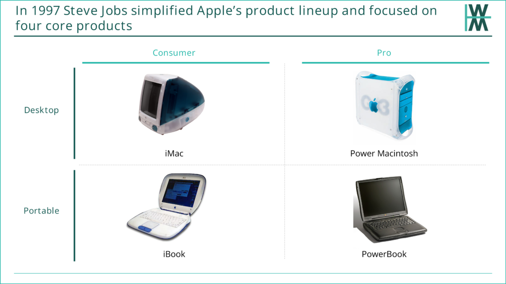 He effectively eliminated everything, started from scratch, and decided to develop only four products. This focus on simplification saved Apple. By the next year, Apple had turned its fortunes from major losses to a $309 million profit.
