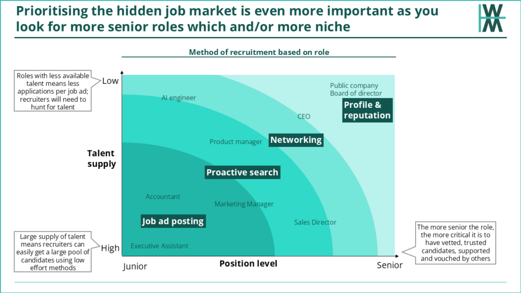 Hirers don’t always rely on the hidden job market. Typically, hirers use a “post and pray” job ad for lower-end roles and incorporate more proactive sourcing and networking for more senior roles. For the most public-facing and externally visible roles, the highest-profile candidates with an existing public reputation would typically attain the most senior jobs, such as CEOs or directorships in publicly listed companies. It’s a combination of two factors; supply of talent and how senior the position is.