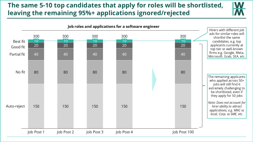 If these “best fit” candidates are applying for the same 100 jobs as you are, you’re in a tough spot. If these 100 Hirers only need to shortlist and interview perhaps 10 candidates (out of say 300 applications), there’s a high chance the majority, if not all of the 100 hirers, will shortlist the same top 10 best fit candidates.